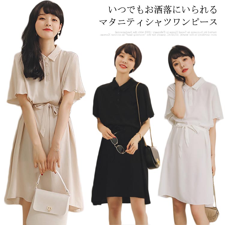 シャツワンピース レディース ミディアムワンピース 膝丈ワンピース 半袖 マタニティシャツワンピース 折り襟 シャツ風 無地 リボン紐付き ハイウエスト お洒落 カジュアル 清楚 シンプル 夏新作