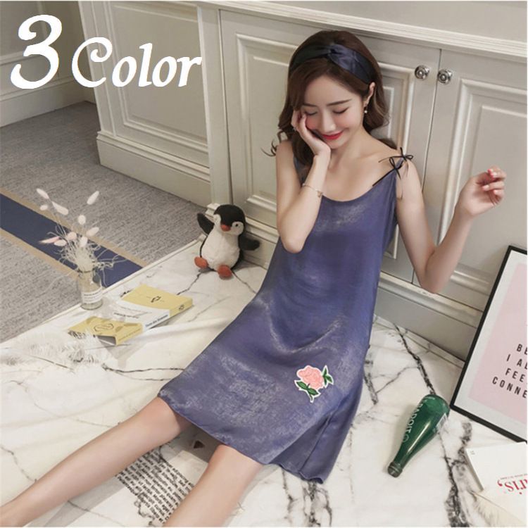 送料無料キャミソールワンピース キャミワンピ ネグリジェ 膝丈 ミディアム丈 ラウンドネック ルームウエア レディース シフォン ルームウェア 部屋着 寝間着 寝巻き パジャマ シンプル ワンポイント 婦人用 M L XL XXL 2XL