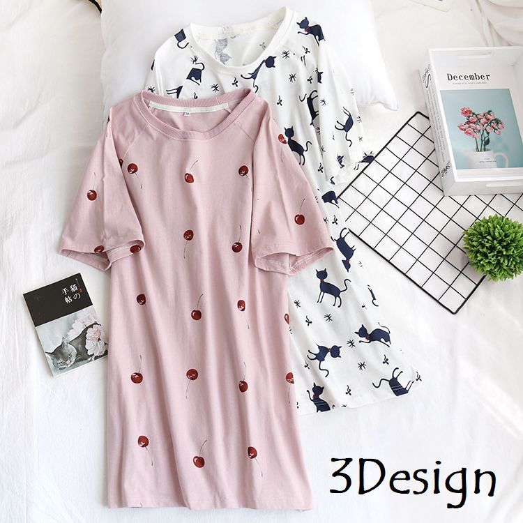送料無料ルームウェア レディース ワンピース 部屋着 パジャマ ひざ丈 ミディアム 半袖 五分袖 ラウンドネック ロンT プリント 猫 チェリー カジュアル ゆったり シンプル 寝間着 丸首 リラックス かわいい 可愛い 女性用 婦人用