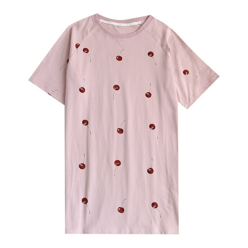 送料無料ルームウェア レディース ワンピース 部屋着 パジャマ ひざ丈 ミディアム 半袖 五分袖 ラウンドネック ロンT プリント 猫 チェリー カジュアル ゆったり シンプル 寝間着 丸首 リラックス かわいい 可愛い 女性用 婦人用